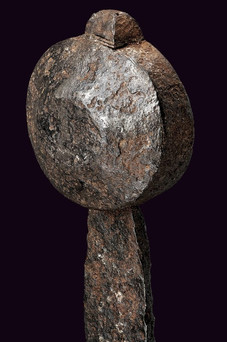 Una espada de mano y media que conserva el material orgánico (interior de madera, revestimiento externo de cuero) de la empuñadura. Las bandas y ranuras que prestan agarre y textura se hacen comprimiendo la piel húmeda con alambre metálico trenzado o cordel. El pomo redondo no solo es un contrapeso, también tiene funciones para facilitar el cambio de agarres.