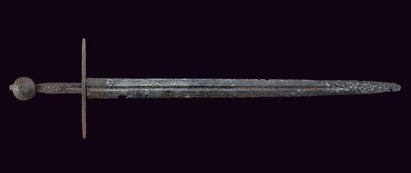 Fabricada cerca de 1425 – 1450, este tipo de espada cruciforme (Tipología Oakeshott XV) se conocen actualmente en España como espada de armas, llamada en Inglaterra arming sword. Se distingue de la "espada larga" o "de caballería" (bajo el término moderno Longsword) por las dimensiones de su mango. Diseñadas para combate en distancias cortas, casi siempre presentan un punto de balance cerca de la empuñadura, lo que las vuelve ágiles y fáciles de mover en la mano, y brinda un mejor control de la punta. Su longitud total promedio es de 95 cms, con la hoja conformando 79 cm. Fue parte de un grupo recuperado dentro de unas cajas de madera durante operaciones de draga en el fondo del río Dordoña (Dordogne) cerca del pueblo Castillon-La-Bataille, Francia, en 1974. Por su ubicación, se piensa que fue usada en la última batalla de la guerra de los cien años (en 1453)